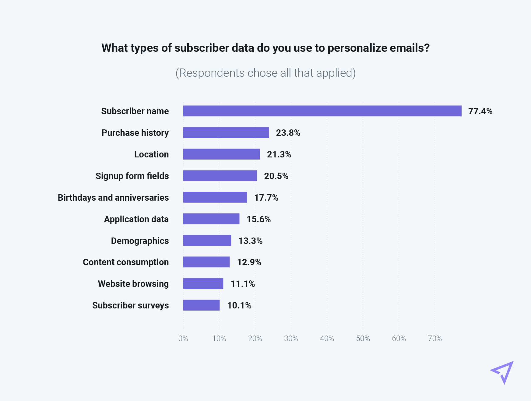 Survey results show less than 25% of small businesses are using “non-name data” for personalization. However, the full Inbox Insights 2023 report found a correlation between successful email programs and senders who deliver personalized product and content recommendations.
