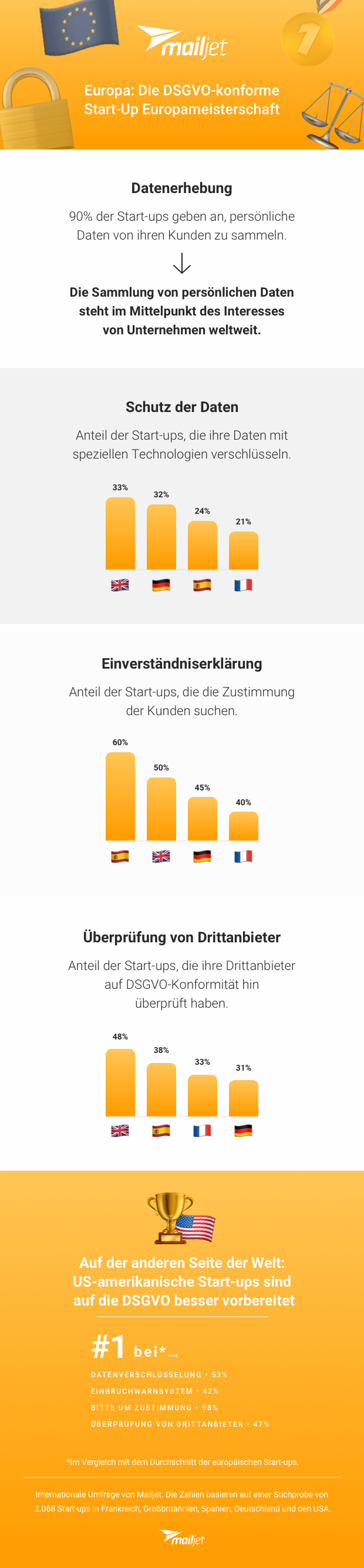 Um Start-Up-Unternehmen auf ihre Verpflichtungen im Rahmen der DSGVO aufmerksam zu machen, hat Mailjet eine Umfrage erstellt, um das Wissen über die wichtigsten Anforderungen der neuen Verordnung auszuwerten. Über 2.000 Start-Ups haben an der Umfrage bislang teilgenommen. Dies ermöglichte Mailjet, eine Stichprobe von etwa 2.000 Befragten aus Frankreich, Großbritannien, Spanien, Deutschland und den USA zu analysieren. Das Ziel? Zu verstehen, welche Start-Ups auf der ganzen Welt bereit sind und welche noch einiges zu tun haben!