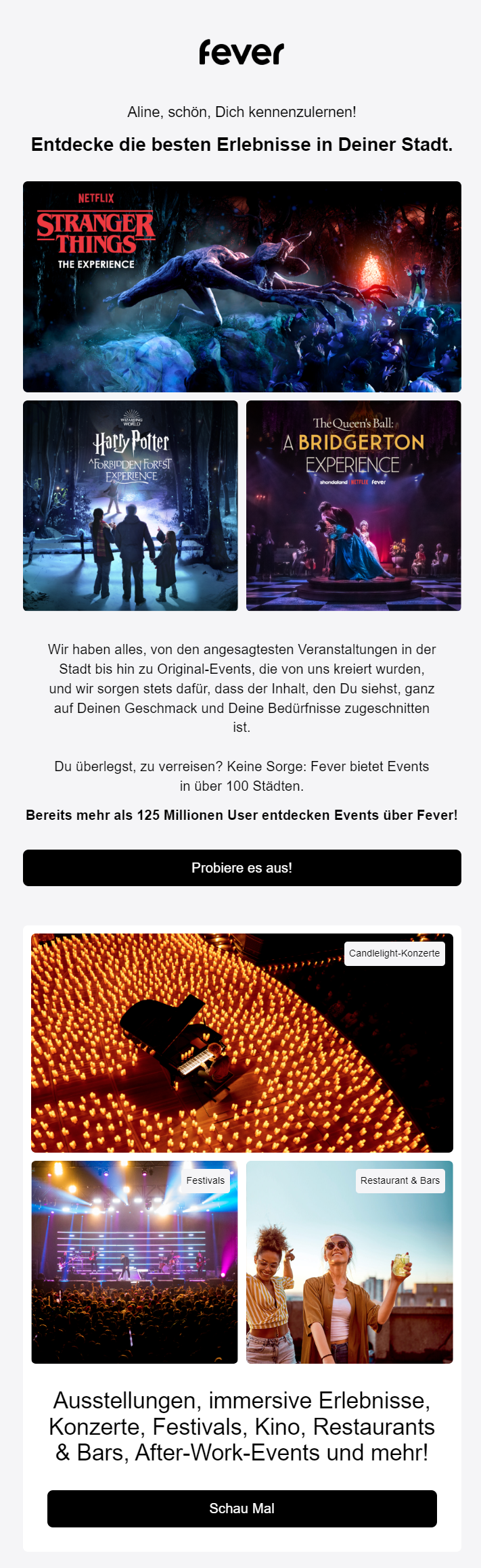 Der Anbieter Fever verwendet dynamische E-Mail-Inhalte, um nach einer Bestellung ähnliche Events anzuzeigen, wie das, welches zuvor gebucht wurde. Das Nutzerverhalten und das Wissen über vergangene Käufe wird so geschickt eingesetzt.