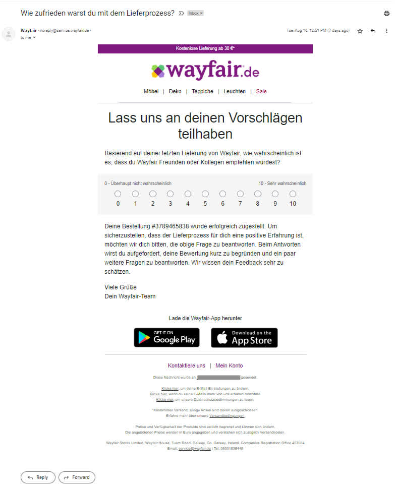 Der Online-Shop Wayfair verschickt eine Noreply-E-Mail die über den Lieferprozessbewertung informiert