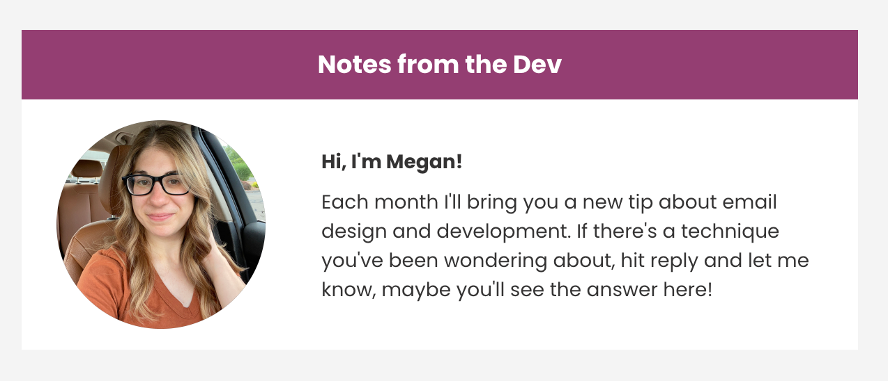 Nuestra desarrolladora jefe de email, Megan Boshuyzen, es la persona que hay detrás de Notes From the Dev, la serie de vídeos y newsletters de desarrollo de Sinch Email on Acid.