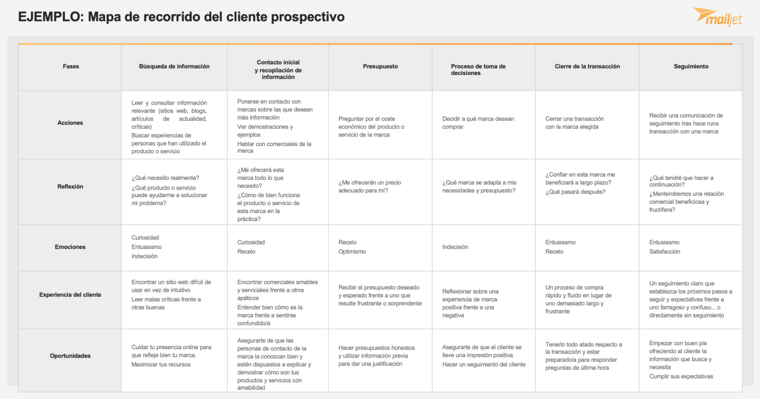 En este mapa encontrarás espacio suficiente para las etapas de las que hemos hablado en este artículo. Además, las combina con categorías que puedes usar (tras haber realizado el recorrido del cliente tú mismo/a) para saber qué están haciendo y pensando tus clientes y cómo están reaccionando. Con esta información, podrás mejorar tus comunicaciones por email con soltura y conseguir tus objetivos de relación con el cliente.