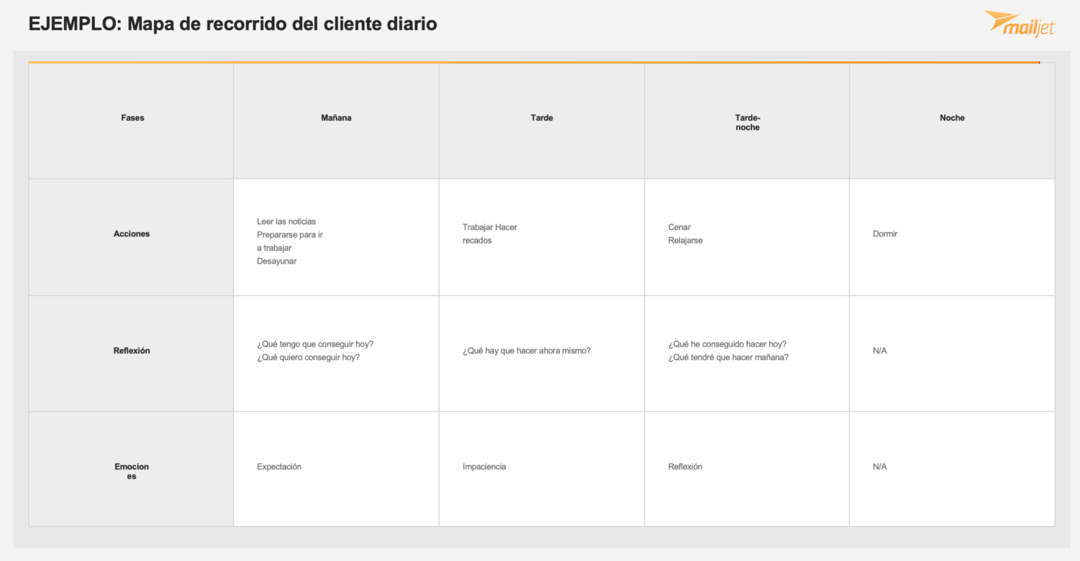 Por último, los mapas diarios reflejan todo lo que hace el cliente durante un día típico, tanto en lo relacionado con tu empresa como con otros aspectos. A continuación verás un ejemplo.