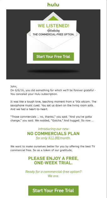 Hay que tener valor para admitir un error, pero Hulu lo hizo con una campaña de email que se enviaba a los usuarios después de que cancelaran sus suscripciones. La empresa de televisión por streaming supo aprovechar las quejas: las reconoció y se puso manos a la obra para cubrir las necesidades de sus clientes, y el resultado fue esta creativa campaña de email. Somos muy fans de esta en concreto porque demuestra que Hulu escucha a sus clientes y no le da miedo reírse de sí mismo.