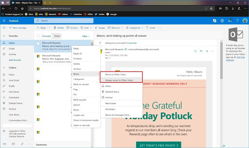 In desktop mode, Outlook follows the email client trend of offering its focused inbox feature as a setting, and users can move messages between the modes: