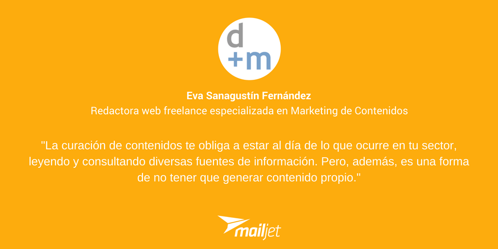 El email marketing suele tener un enfoque comercial: ofertas y noticias corporativas que se envían por correo para recordar a los suscriptores y clientes que seguimos ahí. Es una opción perfectamente válida, pero en mi newsletter utilizo otra: recomiendo artículos que no tienen que ver conmigo, pero sí con mi vida profesional. Solo me permito un par de líneas para enlazar a mi último post y a algún recurso de mi web, así que puede decirse que es una newsletter curada, es decir, un ejemplo de content curation.