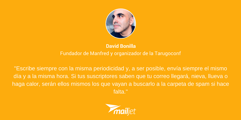 Escribir siempre con la misma periodicidad y, a ser posible, enviar siempre el mismo día y a la misma hora. Si tus suscriptores saben que tu correo llegará, nieve, llueva o haga calor, a la misma hora el mismo día de la semana… serán ellos mismos los que vayan a buscarlo a la carpeta de spam si hace falta.