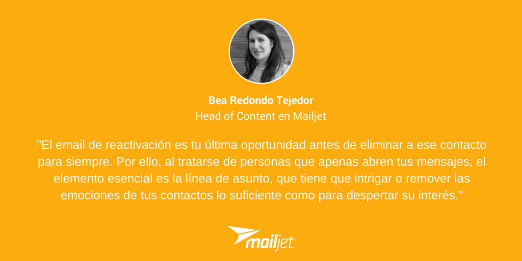 El email de reactivación es tu última oportunidad antes de eliminar a ese contacto para siempre. Por ello, al tratarse de personas que apenas abren tus mensajes, el elemento esencial es la línea de asunto, que tiene que intrigar o remover las emociones de tus contactos lo suficiente como para despertar su interés.