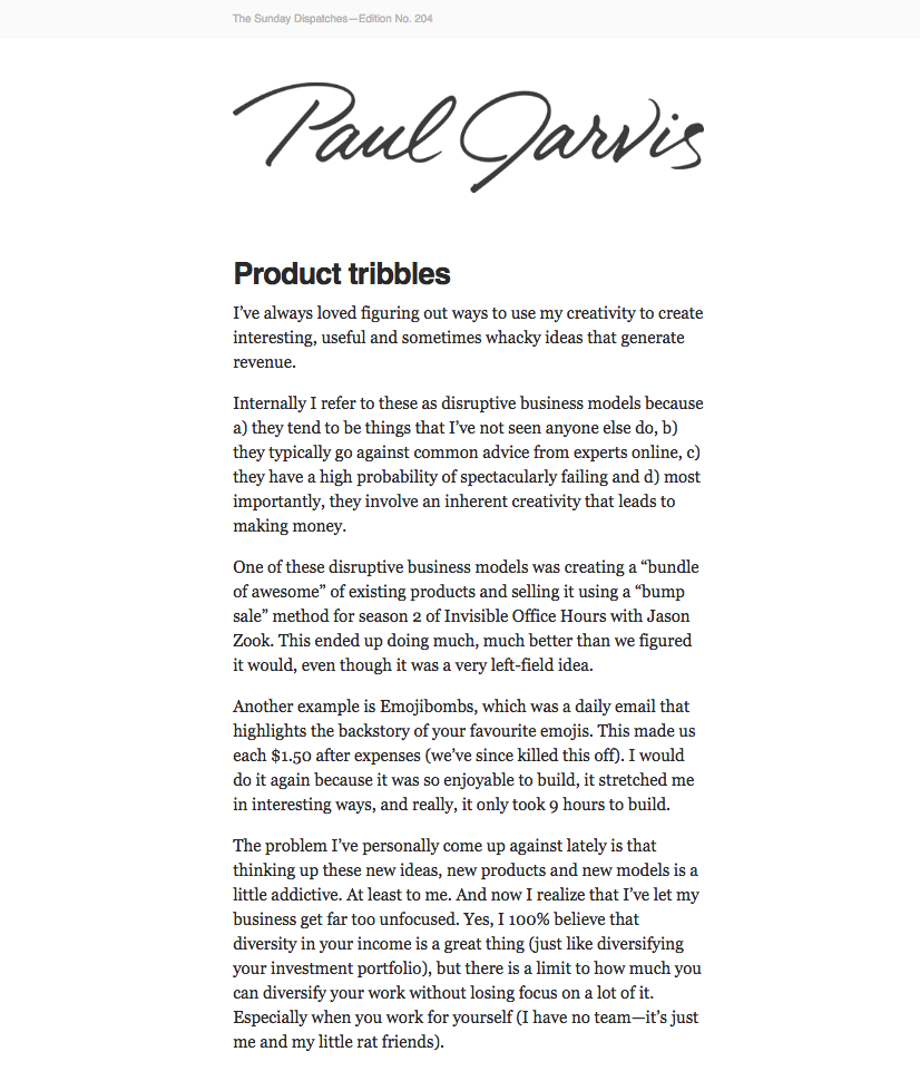 ¿Quieres verlo en acción? Paul Jarvis es un reconocido diseñador autónomo, escritor y desarrollador de software de Victoria, Columbia Británica. Ha escrito artículos para Forbes, Newsweek o BuzzFeed, entre otros. En su serie The Sunday Dispatches aborda temas con los que tiene que lidiar cada día en su trabajo. Unas 22 000 personas ya reciben sus emails una vez por semana.