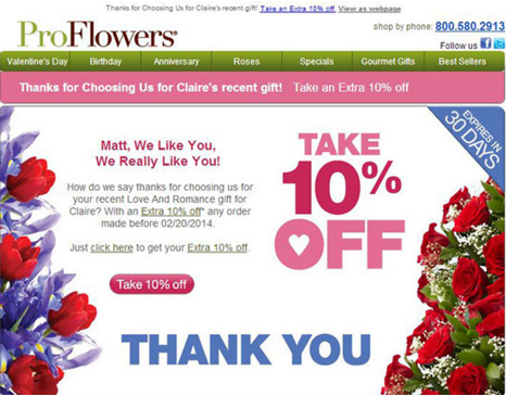 Demuestra a tus suscriptores que les entiendes y valoras individualmente. Ofréceles un regalo en función de sus intereses. Por ejemplo, si abandonaron la suscripción a un producto o su carrito de la compra, tiéntales con una extensión del periodo de prueba, un descuento, una promoción o artículos similares más económicos. Agradéceles su interés o sus compras anteriores y personaliza el email usando su nombre, como en este email de Proflowers: