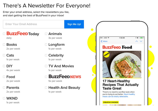 A día de hoy, la página de suscripciones de Buzzfeed ofrece 13 boletines de noticias diferentes que van desde los cotilleos de famosos a recetas, incluyendo la newsletter Un perro al día, que envía a tu bandeja de entrada un perro adorable cada mañana (desafiando de este modo la propia definición de un boletín de noticias).