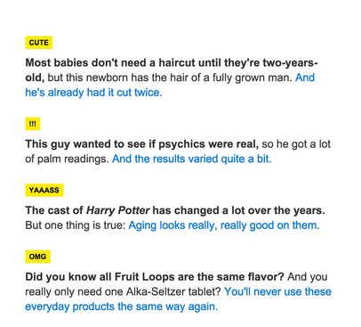 La mayoría de los clickbaits son decepcionantes porque prometen un valor que luego no cumplen — la recompensa no es ni mucho menos tan buena como imaginaba el lector, […] los titulares de BuzzFeed funcionan particularmente bien porque en realidad hacen promesas pequeñas y luego ofrecen más de lo esperado, […] Hace que te sientas validado, que es probablemente la recompensa más valiosa de todas.