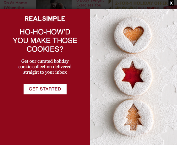 Antes de lanzar una campaña de email, necesitas una lista de destinatarios. Si te has portado bien, ya habrás utilizado herramientas como las ventanas emergentes inteligentes para empezar una. Por ejemplo, la ventana siguiente propone a los visitantes la oportunidad de recibir recetas exclusivas de galletas si se suscriben a la newsletter.