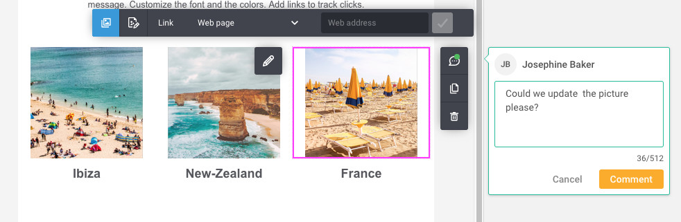 La nueva función de Mailjet te permite añadir comentarios directamente en cada bloque de contenido (texto, imágenes, botones, etc.).