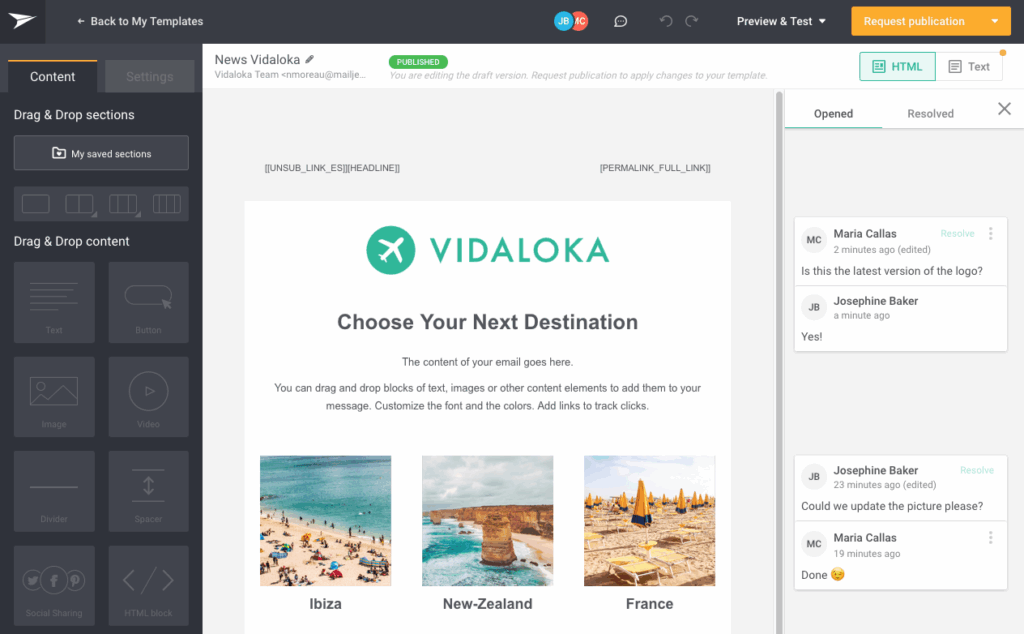 Todos los comentarios aparecen enumerados en el lateral derecho del editor de email y están vinculados al bloque de contenido correspondiente.