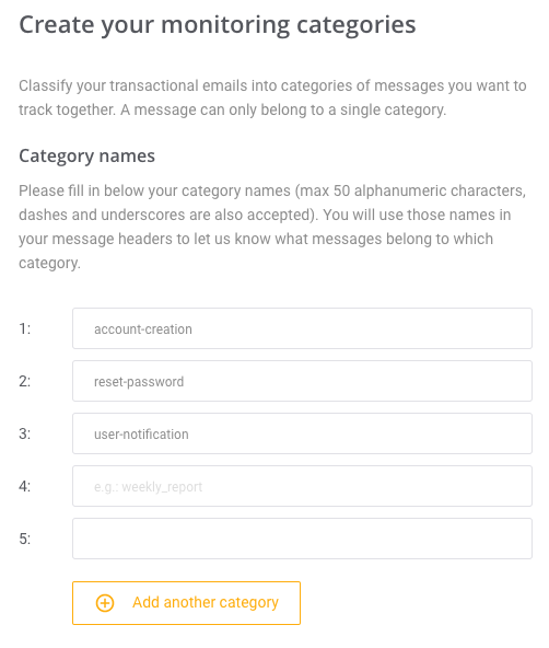 En este ejemplo, hemos decidido clasificar nuestros emails transaccionales en distintas categorías para poder configurar alertas específicas de cada una de ellas: