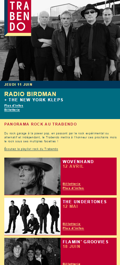 Le Trabendo a opté pour une newsletter colorée mais sobre, reprenant le logo de la salle de spectacle. L’information principale est mise en avant par une image occupant toute la largeur de la colonne. Les textes sont courts et incitatifs. Les liens sont clairs. Le lecteur comprend tout en un clin d’oeil.