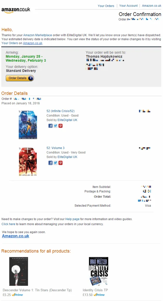Amazon a été à l’avant-garde de ce type d’envoi de messages. La plateforme utilise largement les confirmation d’achat et les factures pour y ajouter des touches marketing intelligentes, avec des produits susceptibles d’intéresser le destinataire (que ce soit parce qu’ils ont un rapport avec l’objet acheté ou parce que le destinataire s’y est intéressé dans le passé).