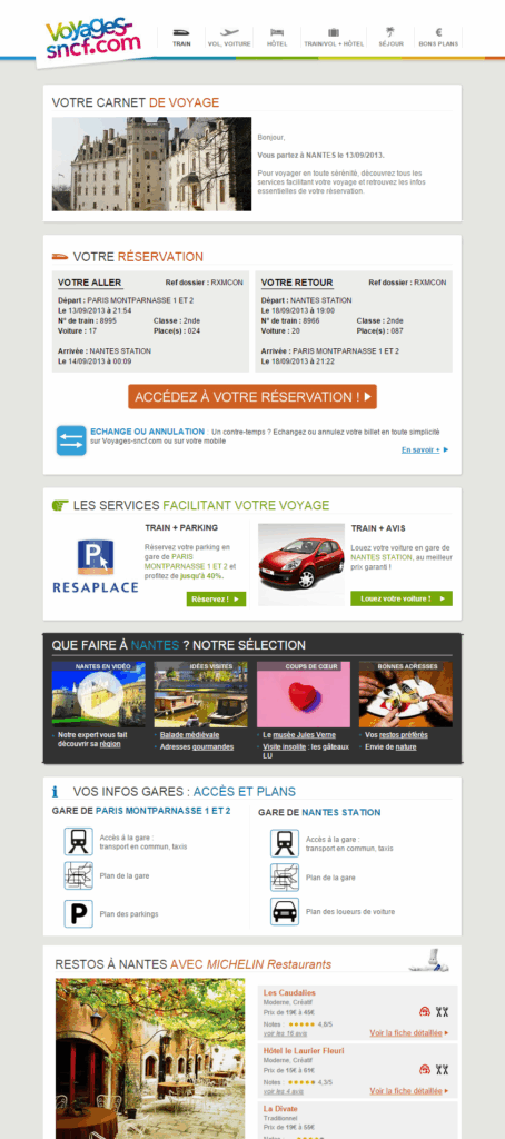 Dans le même ordre d’idées, la SNCF propose à ses clients de multiples services après la réservation de leur billet. Voici un email récapitulatif envoyé après une réservation. La synthèse du voyage constitue, bien entendu, le cœur de l’email. Mais en faisant défiler le message, plusieurs services directement liés à l’arrivée sont affichés. Des services de location de véhicule, des restaurants ou diverses activités recommandés dans la région. Pour cette société de transport de passagers, ces informations sont très utiles aux clients.