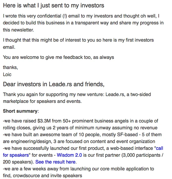Cette newsletter hebdomadaire est un résumé de la semaine écoulée, comprenant des retours directs sur les réussites et les échecs du projet. Il partage même parfois des extraits d’emails envoyés à ses investisseurs afin d’offrir à ses lecteurs une fenêtre directe sur les hauts et les bas de la création et la croissance d’une entreprise à succès.