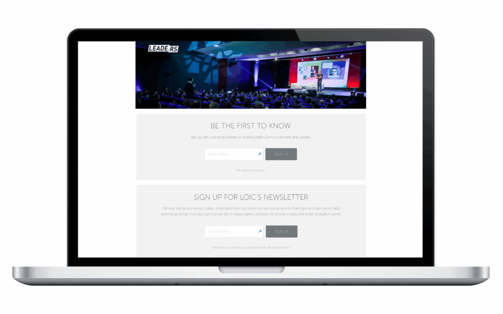 En 2016, Mailjet a lancé une intégration pour les publicités à formulaire Facebook, que Loïc Le Meur s’est empressé d’adopter. Jusque-là, son site contenait un widget d’abonnement qui montrait instantanément aux visiteurs qu’ils pouvaient s’inscrire à une incroyable newsletter.