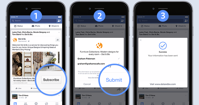 Remplir des formulaires ? Merci, mais non merci ! Heureusement, lorsque l’utilisateur clique sur une publicité à formulaire Facebook, les champs sont déjà préremplis avec les informations de son profil. Loïc Le Meur a créé des publicités encourageant les utilisateurs à s’abonner à sa newsletter, en un clic, sans avoir à quitter Facebook !