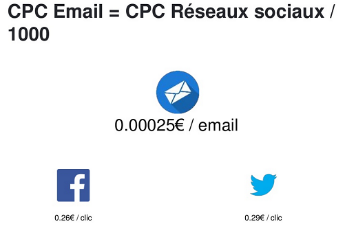 L’email est le canal de communication le moins cher actuellement. A titre de comparaison, un clic vers un tweet sponsorisé ou une publicité Facebook coûte aux alentours de 0,25€. Pour le même prix, vous pouvez envoyer une campagne de 1000 emails !