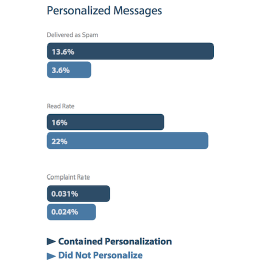 Surprise : plus un email est personnalisé avec un nom ou un lieu, plus il arrive en courrier indésirable, plus les destinataires cliquent “signaler en spam” et moins ils lisent le message. Catastrophique. En plus du temps passé à manipuler des champs personnalisés, le marketeur serait perdant sur les résultats finaux.
