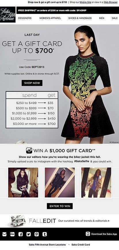 L’email est un excellent moyen pour annoncer votre concours à votre base d’abonnés, et de leurs laisser une longueur d’avance ! Saks Fifth Avenue utilise cette stratégie, et envoie un email très visuel à ses contacts pour annoncer ses concours :
