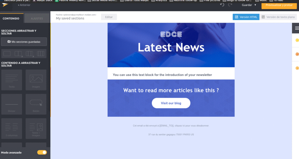 Notre nouvelle fonctionnalité vous permet de faire respecter cette charte graphique plus facilement et efficacement. Préparez des exemples de sections pour chaque type de contenu que vous utilisez dans vos emails marketing et enregistrez-les dans votre bibliothèque.