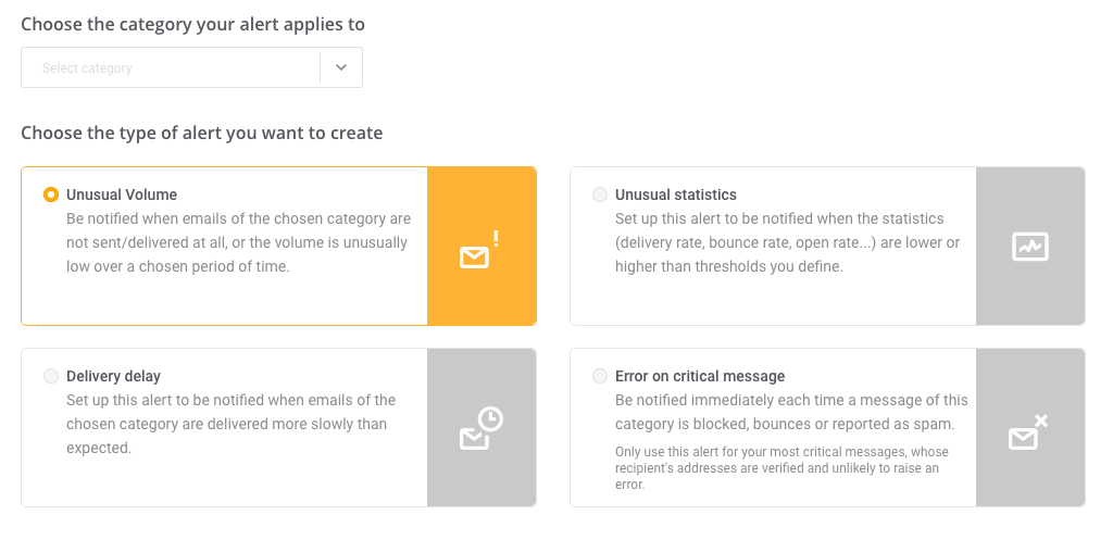 Pour faciliter le suivi de vos alertes, commencez par nommer chaque catégorie de suivi qui vous semble utile, en fonction de ce qui est pertinent pour votre entreprise. Vous pouvez ainsi choisir de regrouper les emails selon leur objectif, leur mode de délivrabilité ou leur impact.