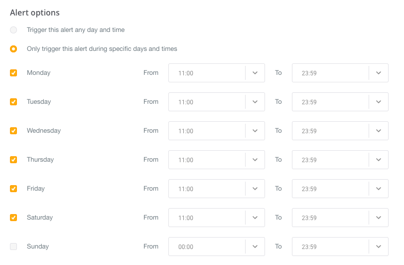 Grâce à la fonctionnalité Real-Time Monitoring de Mailjet, vous pouvez définir le jour et l’heure de votre alerte et le canal à utiliser pour vous envoyer une notification. Vous pouvez donc par exemple choisir d’être averti via Slack et par email en semaine pendant les heures de bureau et créer la même alerte pour recevoir des SMS* en dehors des heures de bureau.